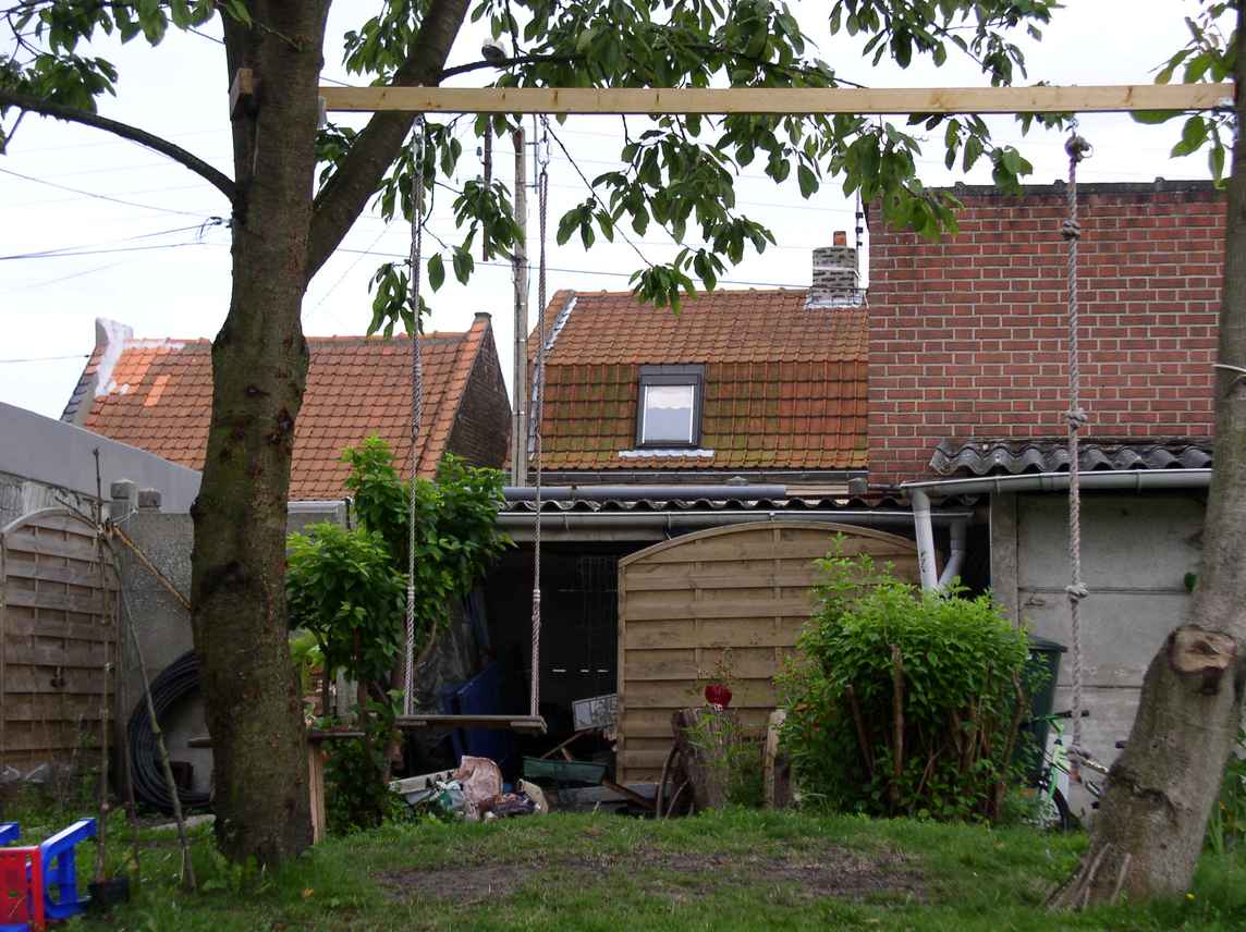 Notamment, je voudrais mettre un petit arbre entre le lilas de gauche et le seringat à droite, pour mieux cacher l'appentis au fonds à gauche (que je garde pour l'instant...) et pour cacher en hauteur la maison en face.