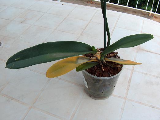 Je trouve la hampe encore bien verte, on sait jamais, un keiki pourrait pointer le nez, ou des départs sur hampe... et les feuilles jaunes, pas besoin de les couper, faut tirer dessus, ça vient tout seul !