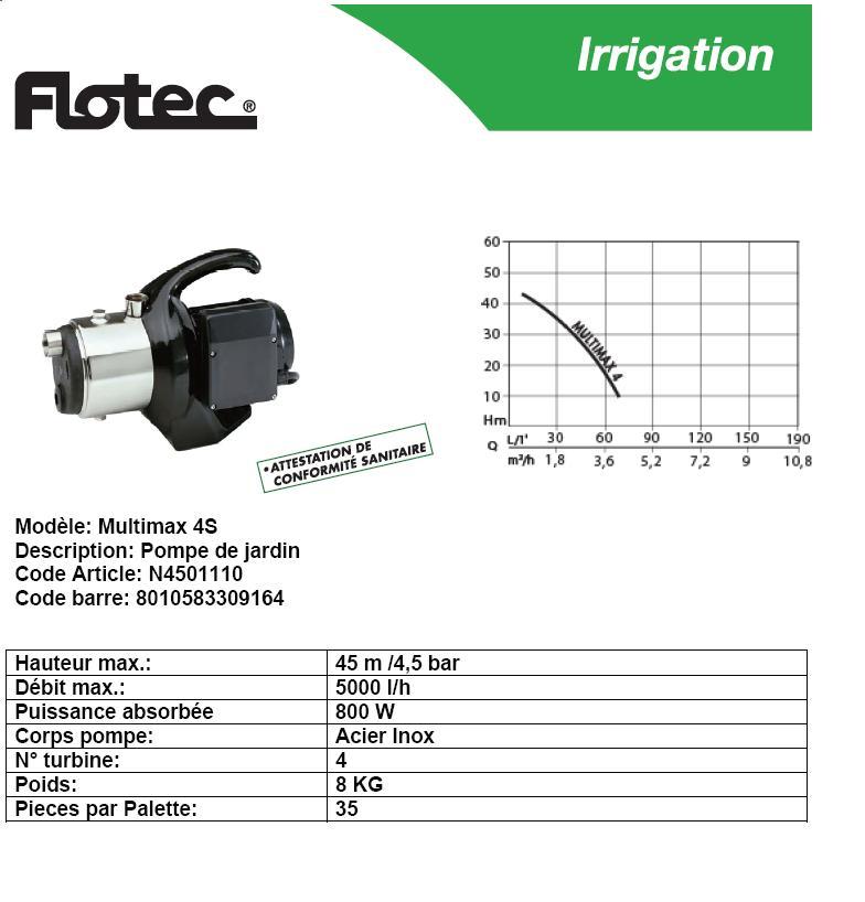 Pour ce qui est de la pompe, j'avais l'intention de prendre la FLOTEC 5s 1250w 6600l/h 60m 6bar dont je vous ai join la fiche technique.