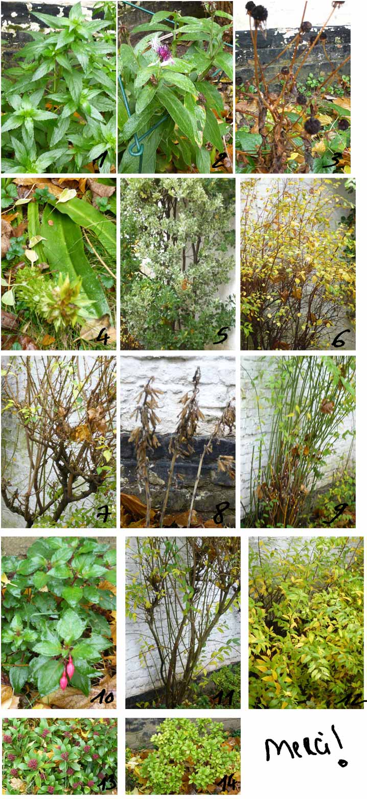 Je viens de déménager et pour la première fois de ma vie, j'ai un petit jardin. Il n'a pas été entretenu pendant plusieurs mois et je ne sais pas du tout comment procéder, mais avant tout j'aurais voulu savoir quels sont ces arbres, arbustes, plantes qui s'y trouvent. J'ai pris des photos, je n'avais pas toujours le recul nécessaire (mon jardin est petit !), j'espère que ce sera suffisant pour une identification. Peut-être que certaines de ces plantes sont des "mauvaises herbes"... Et la saison n'aide pas parce qu'il ne reste plus aucune fleur (si tant est que ce soient des arbustes à fleurs !) J'habite à Bruxelles. Voici en pièce jointe, j'ai fait du mieux que j'ai pu pour que ce soit lisible et pas trop lourd.