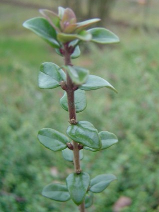 Le feuillage est dense. Les feuilles persistantes sont vernissées sur le dessus et minuscules, de forme presque ovale. Elles font environ 8 mm sur 5 mm. La plante se bouture très facilement.