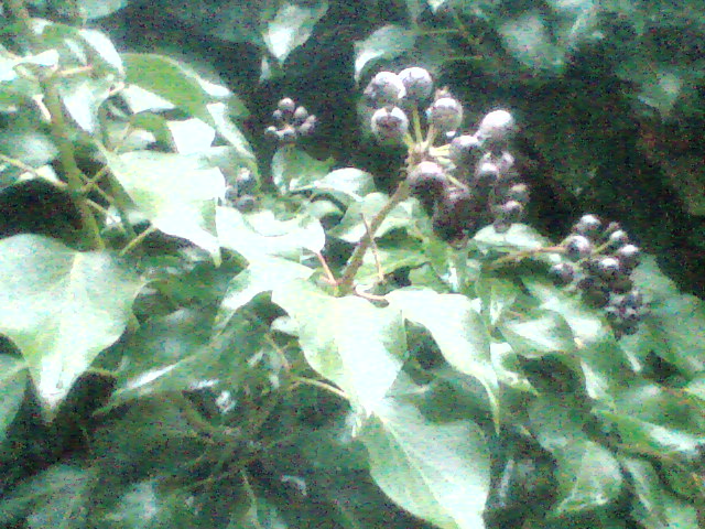 Je vous envoi les photos de mon jardin, en èspérant que les photos seront assez net. Donc il y a ces herbes grimpantes (du lierre je pense) tout autour du jardin ainsi que sur un arbre, et cette plante avec des petites boules noires