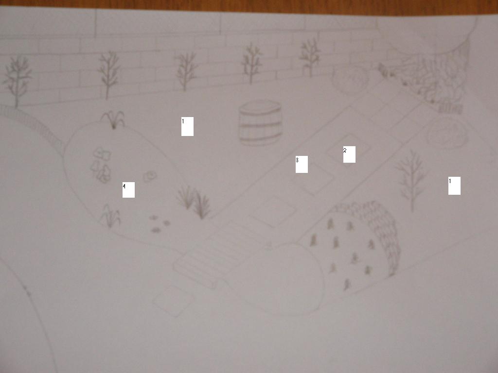 Bonsoir, j'ai l'intention d'aménager un coin de mon jardin avec un bassin (4), deux massifs plantés d'annuelles et de vivaces (1), et un petite allée avec de l'herbe (3) entre les dalles (2) située entre les massifs (1). Je joins le plan. Qu' en pensez vous ?