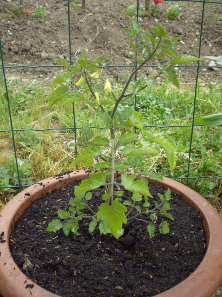 et mon unique variété en pot, la tomate "petit poid", je n'ai pas le nom exact mais j'ai trop hâte de voire ce qu'elle va donner, déjà en fleur depuis plus d'une semaine et mimi tout plein avec sa petite taille, ses petites feuilles et ses mini fleurs !!!!