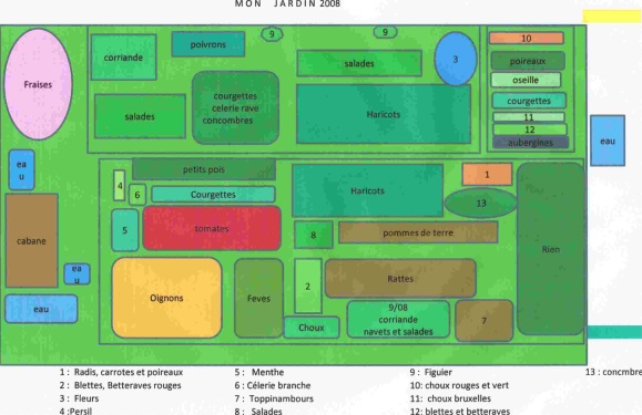 Voici l'esquisse plan du jardin version 2009, il y à surement des erreurs dans la complémentarié des plants, mais rien est figé du fait que peu de chose sont en place et que le démarrage des plantations sera mi avrli le temps que les semis soint opérationnels.
