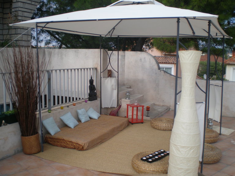 voila ma terrasse bon la c'etait a la cremaillere donc le decor est en supplement ... depuis il y a des canisses tout le tour