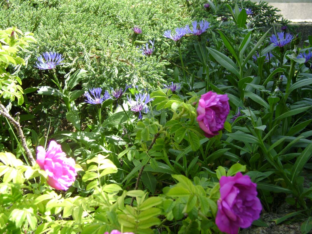Puisqu'on parle de centaurées, les voici mariées à un rosier Rugosa. Dans un autre jardin je les avais associées à des tulipes "Angélique" (fleur double, rose tendre) : c'était magnifique ! la plus belle association que j'ai réussi mais c'était il y a 15 ans. Pas de numérique et pas de photos du tout d'ailleurs... :cry: