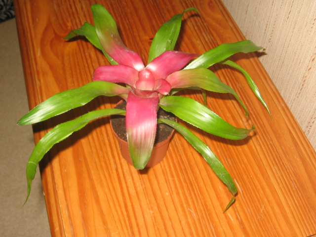 C'est une broméliacées c'est sûr, moi j'opterais pour une des innombrables variétés de broméliacées NEOREGELIA, peut-être neoregelia aquaris ou neoregelia aristocrat ou neoregelia concentrica mais il y en a des tonnes je mets un lien ou il y a la photo de 3774 variétés.