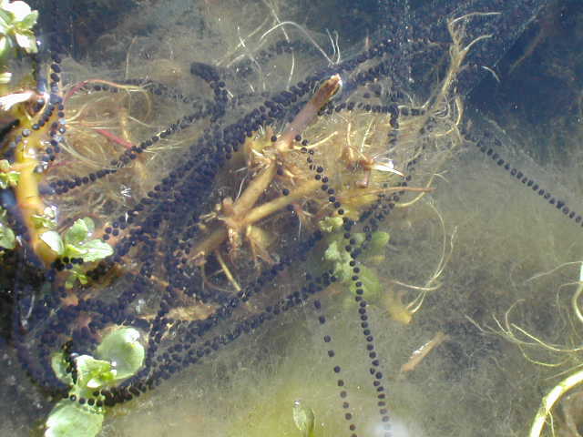 Au matin, je n'avais rien dans l'étang. Vers 16 hrs, je trouve une espèce de chapelet composé d'oeufs ??, mais de qui, de quoi ?? J'ai en tout et pour tout 8 poissons dans l'étang: 4 rouges, et 4 de ± la même race, mais bleu. Il y a environ 5 jours, j'ai apperçu au soir une espèce de gros crapaud, qui a disparu au bout de 5 minutes, et depuis plus rien: je vais voir plusieurs fois sur la journée, mais plus de trace de ce crapaud. Aujourd'hui, voilà la découverte. Quelqu'un peut-il m'aider.