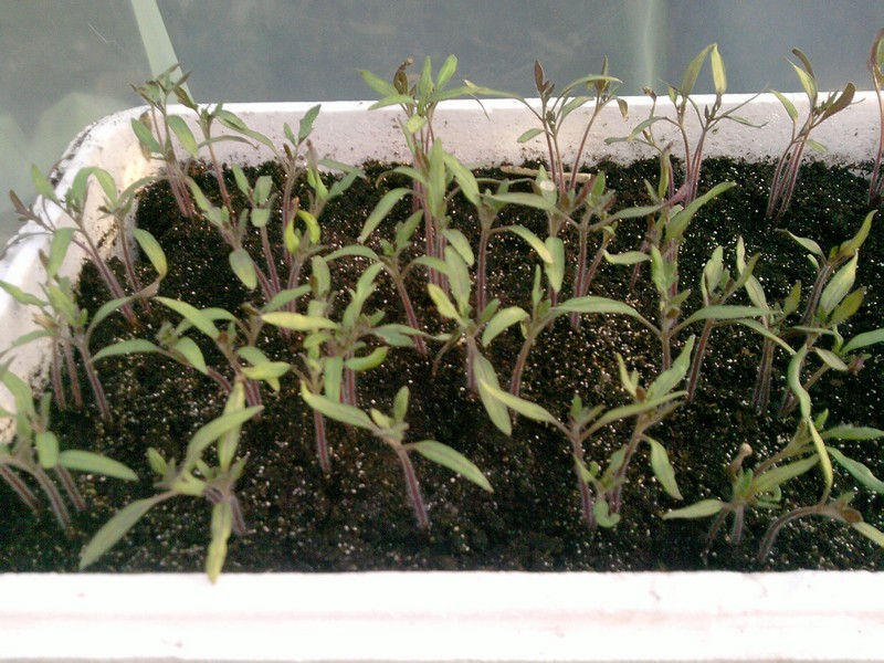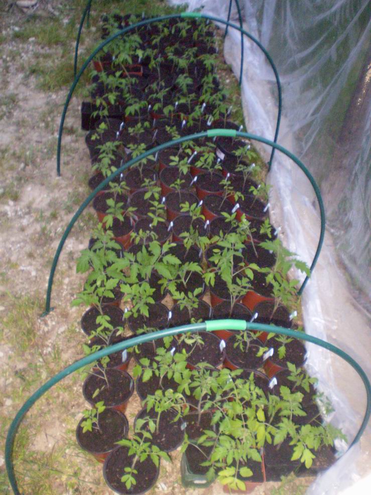 Dans la serre j'ai plein de bébés tomates, aubergines et courges de Nice.