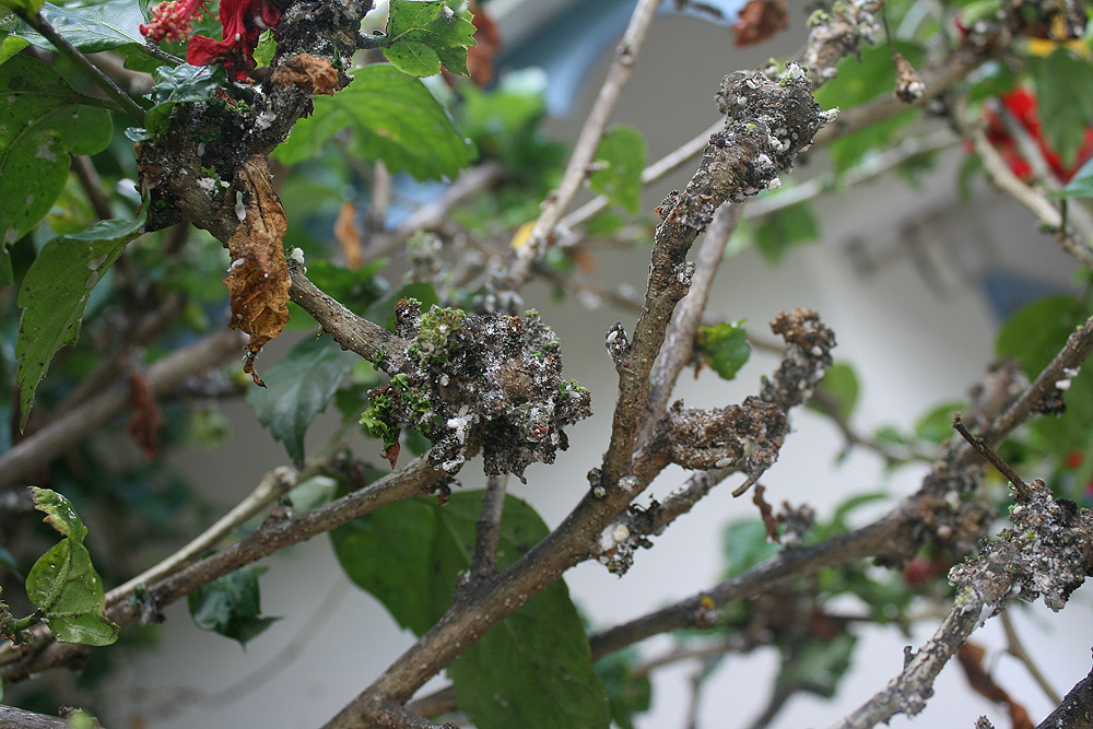Je vis en guadeloupe depuis 7 ans et depuis quelques temps je subis une attaque sur mes plantes. En effet j'ai des bêtes blanches dessus. J'ai pensé à des cochenilles, alors j'ai essayé d'abord un produit à base d'huile (traitement ts les 15 jrs pendant 2 à 3mois) , mais cela fût sans effet. j'ai ensuite coupé la plante puisqu'elle avait perdu toutes ses feuilles. Mais aux endroits ou j'ai coupé il y a des grappes de cochenilles et la plante ne repousse pas. En jardinerie on m'a conseillé (insecte polyvalent à base de deltaméthrine. Mais je n'ai pas vu beaucoup d'effet les photos que je vous envoie sont apres ces traitements. J'ai remarqué des oeufs vraiment au bas de la plante donc peut etree faudrait il tout coupé. En plus j'ai remarqué que les bêtes attaque un deuxième hibiscus juste à coté. J'ai de plus beaucoup de fumagine un peu partout (dépot noir) :pastop: Aidez -moi SVP