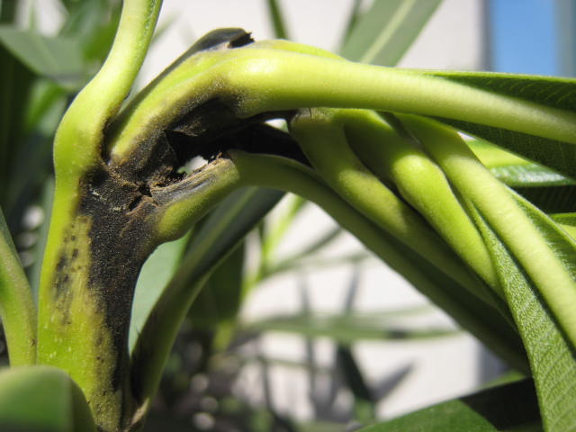 la bactérie responsable est véhiculée par l'eau de pluie, il ne faut surtout pas laisser une plante infectée dehors, en particulier par mauvais temps...