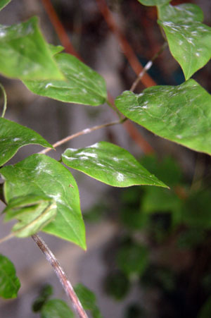 A mon grand désespoir, ma clématite fait pour la seconde année consécutive des taches blanches (comme de la cendre) sur les feuilles et les tiges. C'est juste une couche superficielle, mais qui fait dépérir la plante peu à peu.