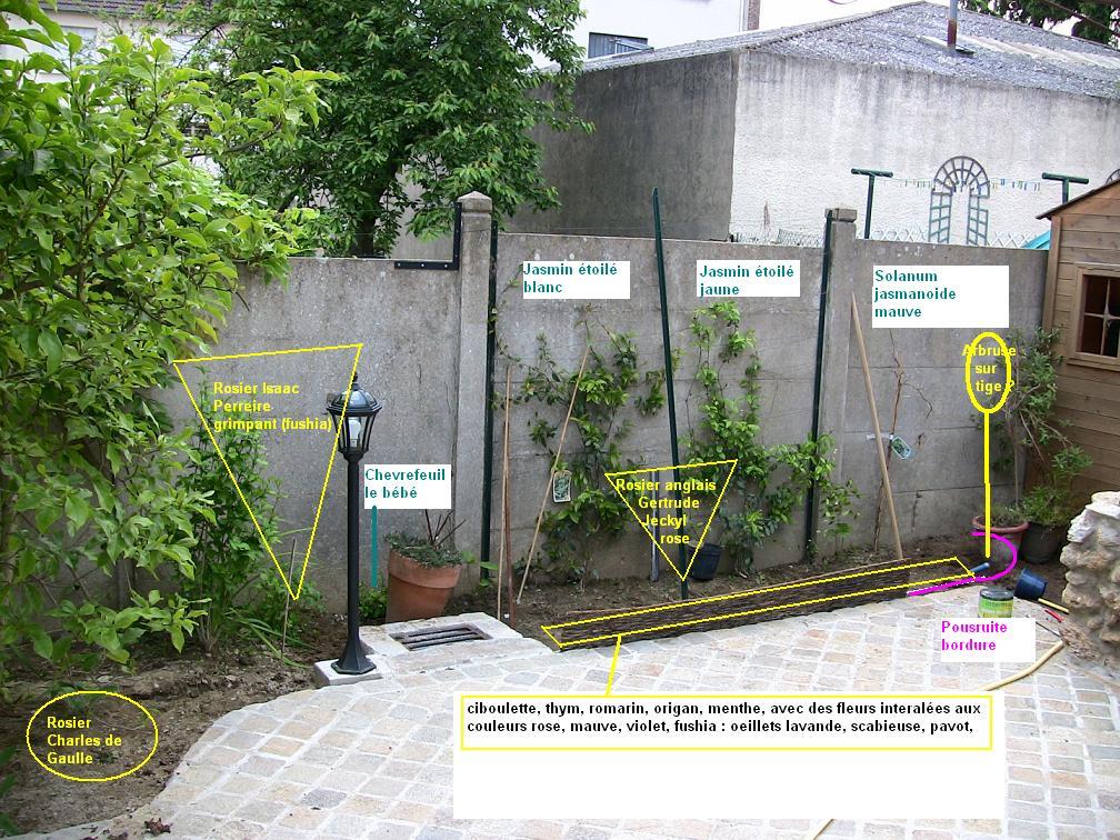 bonne idée les couvres sols mais vont 'ils se voir derrière la bariere (20cm)?C'est également une trés bonne idée de rajouter une jardinière en hauteur, il faudrait que je puisse l'attacher sur le mur.pastellière a écrit :Il faudrait quelques plantes couvre-sol au pied des rosiers et des arbustes : des géraniums vivaces par exemple. Des lavandes et du népéta qui vont très bien avec les rosiers. Peut-être aussi un clématite avec les grimpants. quelques plantes qui dégoulines dans les jardinières en hauteur et là où tu as mis des petites barrières : aubrétias, corbeilles d'argent et d'or, mousse phox, campanules des carpates. Pense aussi à la sauge Grahamii (plutôt en rouge violacée qu'en rouge vif) qui fleurit tout l'été et à la sauge de Jérusalem (phlomis); Tu as un très beau carrelage : ce serait bien que les plantes débordent un peu dessus. Si j'ai d'autres idées, je reviendrai t'en parler.A+