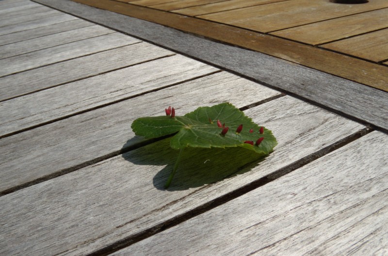 > J'ai un tilleul dont certaines feuilles présentent des espèces d'oeufs rouges pointus (voir la photo)...Qu'en est-il ? et comment traiter cet arbre aux dimensions imposantes (diamètre du feuillage à sa base environ 8 mètres). Par ailleurs l'ensemble du feuillage n'a pas son aspect habituel ! C'est un peu comme si les feuilles étaient légèrement flétries !