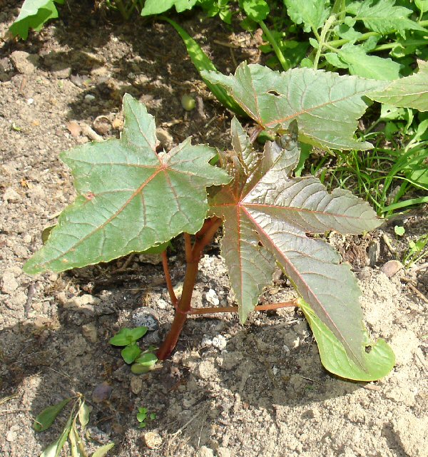 Cotylédons ronds<br />Deux feuilles suivantes imparfaites<br />Une feuille à sept lobes pointus ; la tige part de dessous la geuille et non du bord.