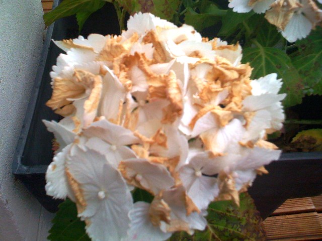 nouveau sur ce site, je cherche des conseils concernant mon orthensia; acheté récemment, planté dans de la terre de bruyère, il a très bien fleuri et tout d'un coup s'est mis à faner: les fleurs sont devenues marrons sur les bords et les feuilles aussi (cf. photos).