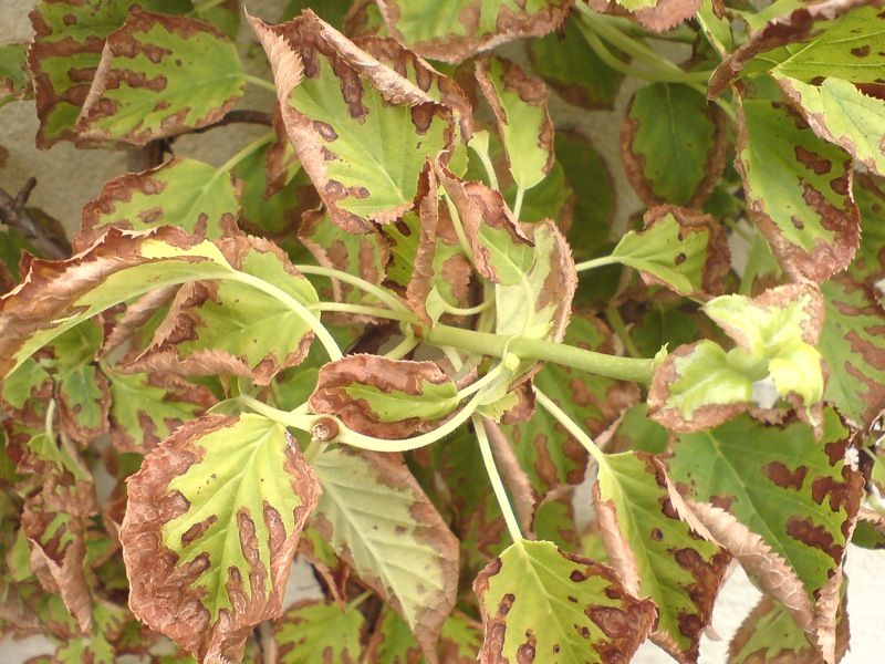 Les feuilles de cet hydreangea grimpant installé dans un bac sur un balcon exposé au nord ouest se sont brusquement couvertes de taches brunes. Les nouveaux bourgeons qui semblaient sains au départ sont à progressivement atteints.
