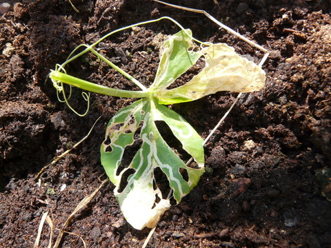 On m'a prété un appareil photo numérique et je peux aujourd'hui montrer une feuille de petits pois qui a dû être grignotée par des ravageurs... Et il y en a plein comme cela sur mes petits pois... Quelle est cette sorte de ravageur ?