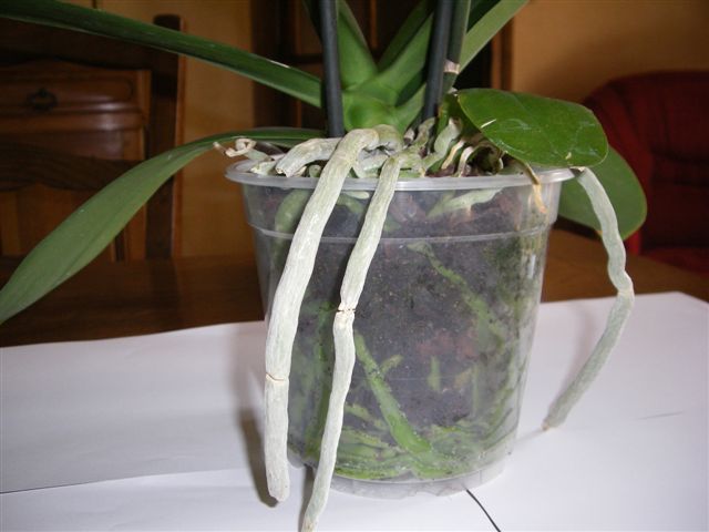 Il s'agit d'un gros phal dans un pot de 15 cm, avec de grosses feuilles et de grosses racines qui dépassent de partout, y compris dessous le pot (voir photo que j'avais jointe). Il faut donc plus ou moins d'eau ??????????