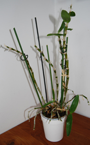 j'ai récupéré une orchidée d'une amie depuis 3 semaines. Elle ne se portait pas très bien elle a perdue toute ses feuilles sur les grandes tiges; mais depuis une semaine à peu près, elle refait de nouvelles feuilles. Je souhaiterais savoir quel est le nom de cette orchidée et avoir quelques trucs pour la faire repartir.