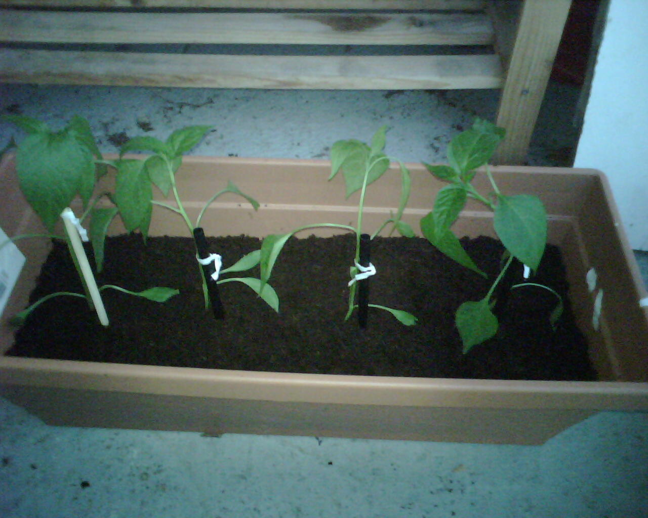 et d'autres poivrons (ou piments :? ) sans tuteurs. ils ont l'air ratatinés non? un tuteur d'urgence?