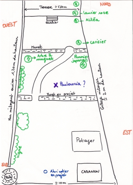 Bonjour et bienvenue sur ce forum. Je vois que tu as abandonné l'idée du paulownia. tu as bien fait car ds un petit jardin comme ça, tu aurais été obligée de le tailler et tu n'aurais pas eu de fleurs car les bourgeons à fleurs apparaissent en automne sur les tiges de l'année et s'ouvrent au printemps. Il prend vite des proportions impressionnantes!!