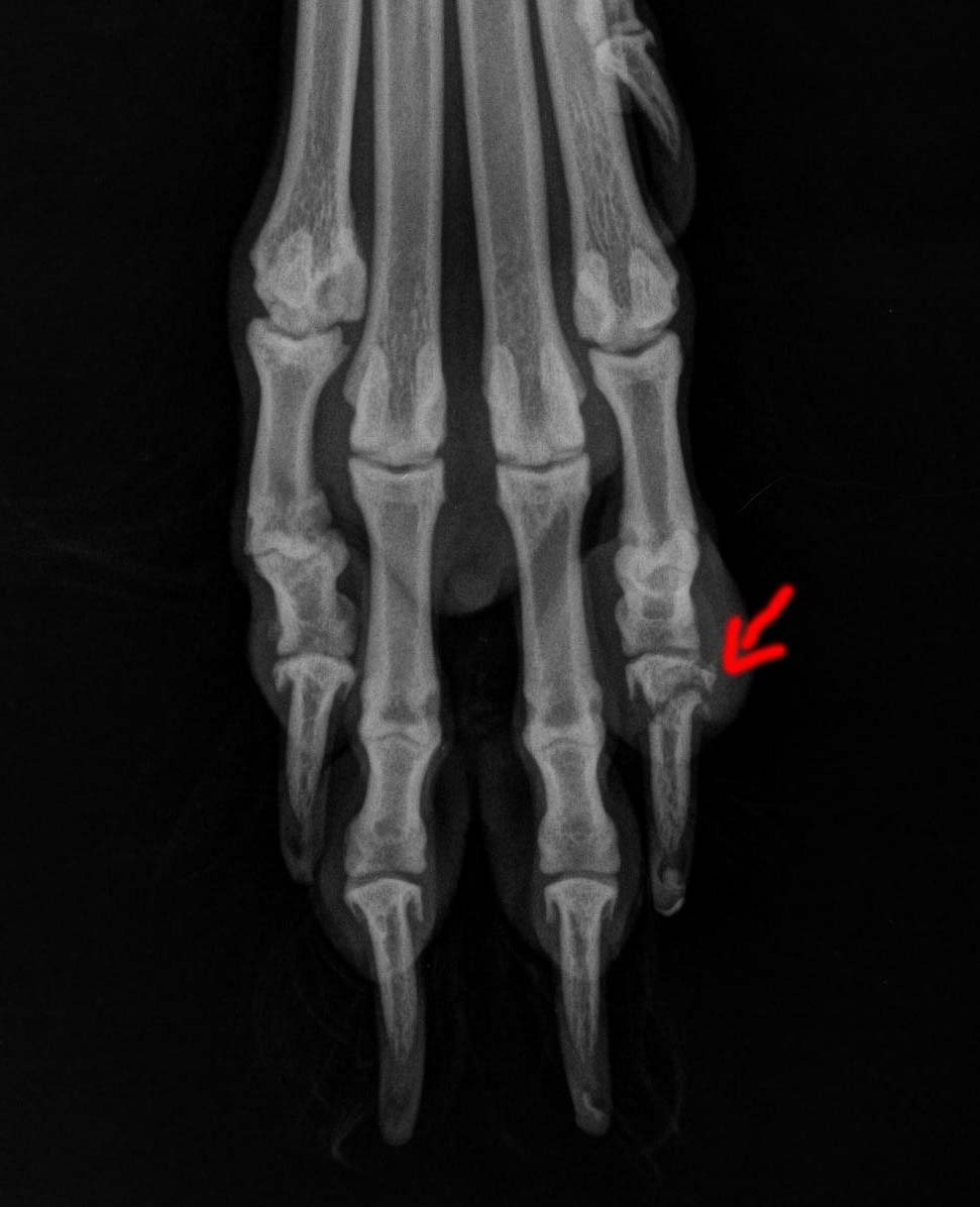 De nouveau anti-inflammatoire + bain de patte pour garder le tout propre + repos total (le plus dur car elle est très vive quand elle ne dors pas) pendant 2 semaines et nouvelle visite pour voir si ça va mieux. Le problème résidant dans le fait que c’est une zone qu’ils ne peuvent pas plâtrer ni opérer car pas super pratique (à ce que j’ai compris). Si ça ne va toujours pas mieux il faudra envisager de lui amputer le doigt.