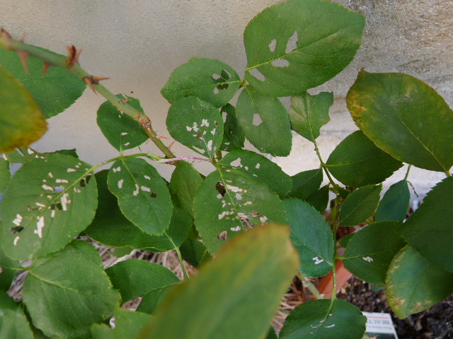 J'ai vu sur les feuilles de mon rosier des petites taches blanches (on avait l'impression que l'intérieur de la feuille était mangé), qui se sont ensuite transformées en trous.