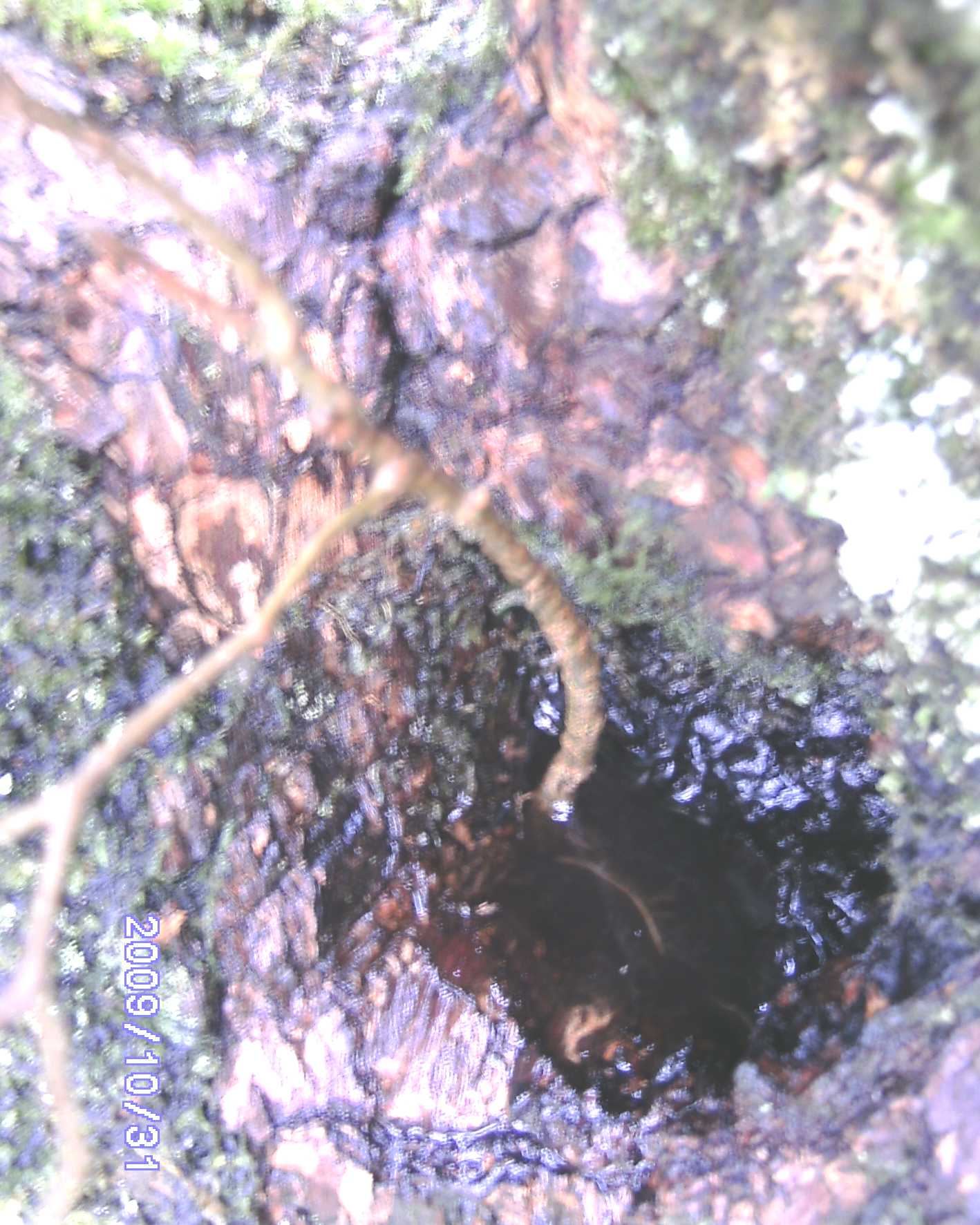 Bon, j'ai nettoyé ce trou naturel d'entre 2 grosses branches, avec mon karcher. Il mesure bien 10 cm de profondeur et autant de diamètre. Ensuite, j'ai pu arracher le frêne, mais avec un gros effort. Il devait se plaire là, et je pense qu'il avait ses racines bien immiscées dans l'écorce particulière du kaki.