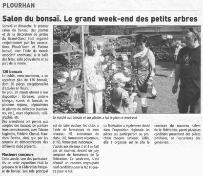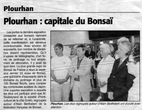 Après le plébiscite de la 1ère édition de 2009,le salon Bonsaï, Fleurs et Jardins de Plourhan (22-Côtes d'Armor) devient international. L' association Parlons Bonsai.com organise les 22 et 23 mai 2010 un évènement unique sur 3500 m² qui regroupe en un seul lieu et sur un week end des intervenants parmi les plus reconnus, une exposition d'arbres de haut niveau jamais exposés, une exposition-challenge de clubs, un marché aux plantes rares (orchidées, succulentes...), et des professionnels du bonsai, matériel et poteries provenant des quatres coins de France et d'Europe. Plus d'une 20aine de stands pro et un nombre très important de bonsai sont attendus. Cette manifestation s'annonce d'ores et déjà comme un moment unique et incontournable, à ne rater sous aucun prétexte. La famile ne sera pas en reste, car la côte est à 2 pas. Réservez votre week-end de la pentecôte pour cette grande fête du bonsai.