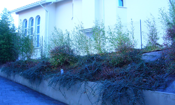 Et dans la partie plus élargie et en pente (voir photo), à la place des cotonéaster, je souhaite mettre qqs pittosporum tobira nanum (que j'ai ailleurs dans le jardin) et qui seront donc aux pieds des bambous.