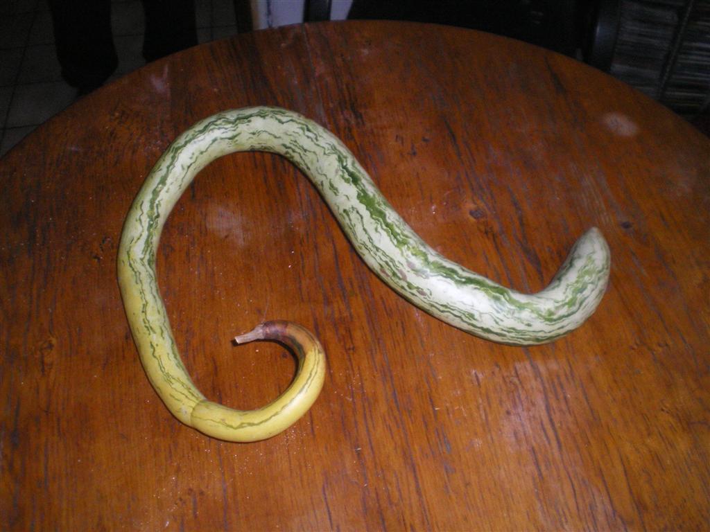 Bien vu! celle ci a poussée au sol. L'année derniere j'en ai fait une droite de 1,08m bien palissée. La variété c'est "snake spekled". Bien sur ce n'est pas pour manger! Pour ça il y a butternut, buttercup et autres.