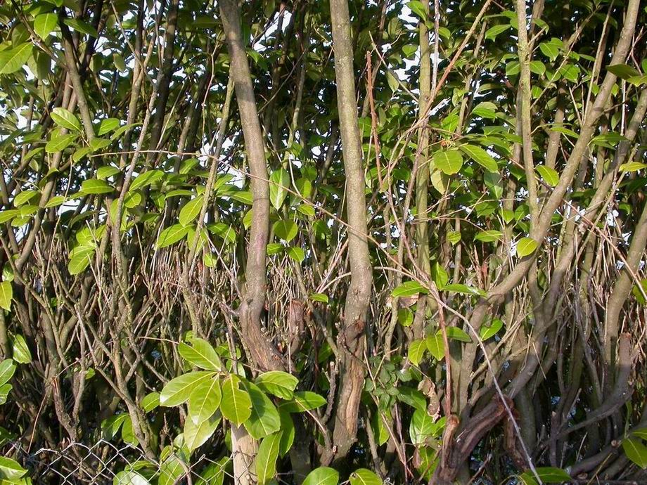 Pour rajeunir une haie de laurier palme, c'est facile et rapide. On coupe tout à la tronçonneuse à 50 cms du sol dès maintenant et au printemps ça repartira en jeunes branches qu'on pourra tailler dès l'année prochaine. Je fais ça chez les autres(clients).