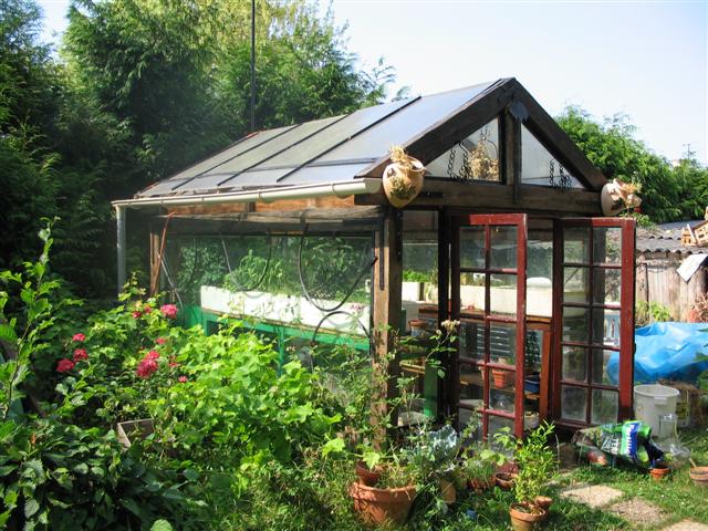 Voilà la mienne: bois de récup (du chêne!) verre de récup (vitrine de magasins et portes) polycarbonate de récup....