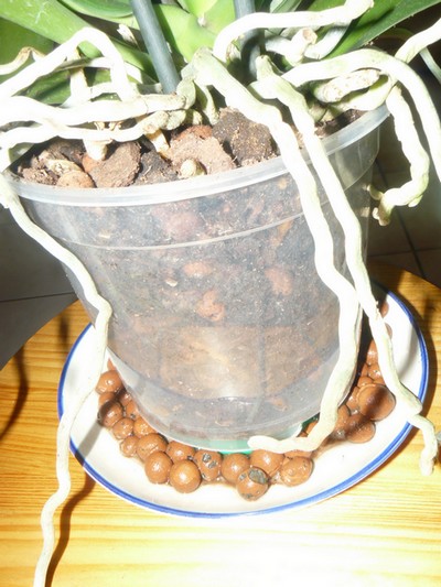 Les feuilles sont bien vertes également. Mais en scrutant, j'ai pu voir une racine au bout bien moisi qui sortait de terre. J'ai donc filé au gamm vert (toujours le même) pour acheter de quoi constituer un nouveau substrat, et rempoter, afin de vérifier qu'il n'y ai pas d'autres racines pourries. J'ai donc délicatement enlevé la plante de son pot (transparent) pour m'apperçevoir que les racines (7 ou 8) que l'on apperçevait a travers le pot étaient bien vertes. Mais celles du coeur de la plante ont plutôt une couleur marron très clair (proche de l'orangé) cependant elles sont fermes. J'ai été rassurée de voir qu'il y avait peu de racines endommagées et molles, j'ai coupé ceci, coupé les racines aériennes qui étaient ultra seches (comme de la paille) et j'ai rempoté dans un mélange de terreau pour orchidée, composé d'écorces et de tourbe (je sais que ce n'est pas l'idéal, ça doit être le même que celui de la plante de départ). J'ai rajouté à ce mélange des billes d'argiles. Je n'ai pas pensé a prendre des photos des racines un peu marron pour vous les montrer par contre. J'ai ensuite placé le pot dans une soucoupe a bords hauts, avec des billes d'argiles et de l'eau, et posé le pot sur un socle, avec un trou, en attente d'un vrai plateau et si possible d'un grillage.
