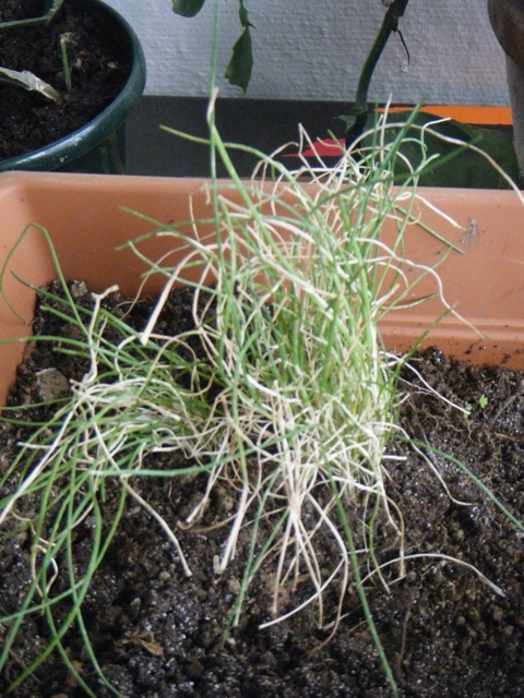 Quand tu repiqueras à l'extérieur ta ciboulette, coupe la motte en 4 et installe les 4 éclats à des endroits différents, ça te fera 4 pieds.