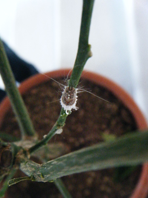 - par contre je viens de remarquer quelque chose qui doit être récent car j'avais bien regardé ses branches avant de le mettre dans ma véranda et il n'y avait rien de particulier. Mais là j'ai remarqué des petites choses sur les branches uniquement. Comme des petits cocons de chenille... C'est curieux...