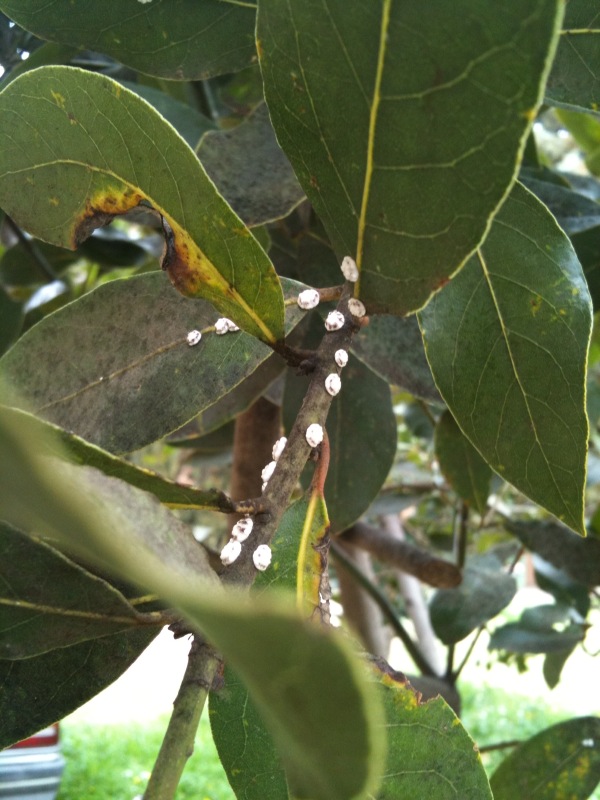 Comment puis je traiter ce type de parasite sur mon laurier? Il s'agit de boules plates et blanches sur les tiges et les feuilles. A l'interieur, c est rouge.