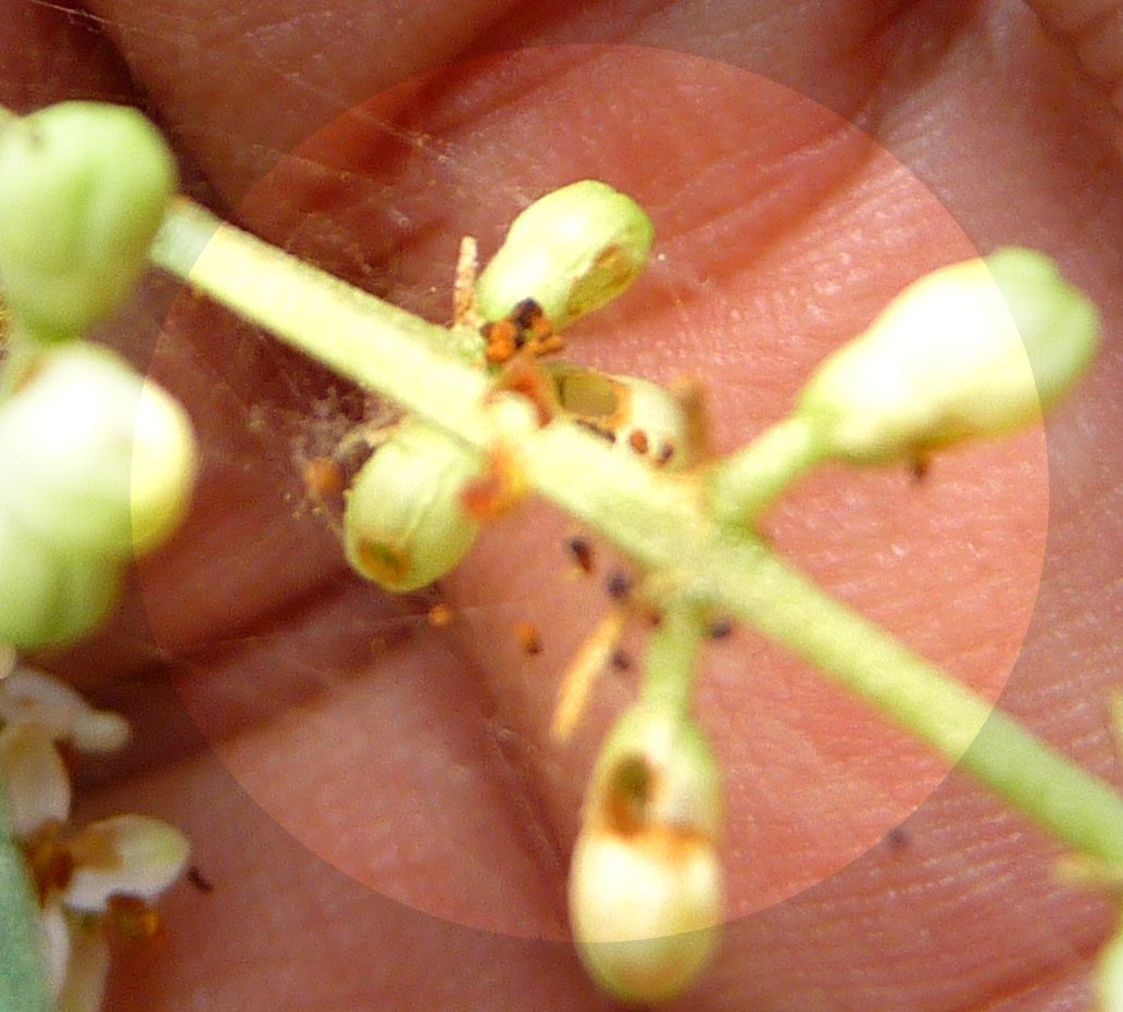 J'ai photographié des oliviers et des orangers dont les fleurs étaient infestées de toiles d'araignées et de petites granules ressemblant à des oeufs. En étant aller voir un vendeur de produits de traitements chimiques il me dit que c'est normal et qu'il n'y a pas à s'inquiéter.