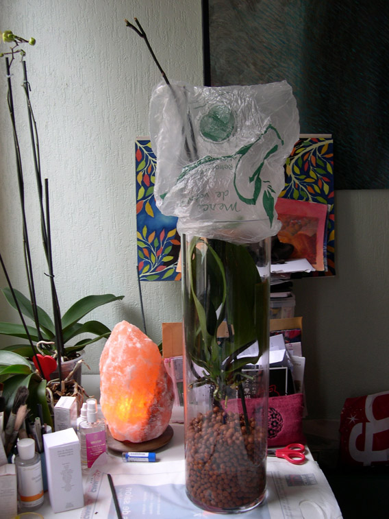 Ds un premier temps je l'ai rempoté et le lendemain j'ai préféré essayer la technique du sac plastique vu qu'elle est mal en point. Je ne suis pas sure de moi et de mon installation, c'est la première fois que j'ai une orchidée ds cet état.