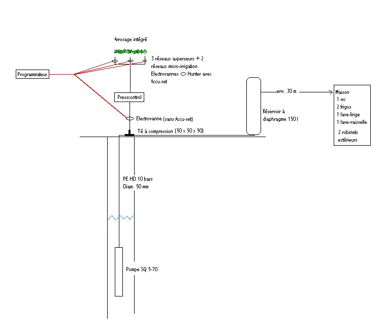 Oui c'est vrai, même si je ne l'ai pas indiqué sur mon schéma j'y avais pensé en voyant ce que le foreur remontait par moments.Il vous faut prévoir une VRAIE filtration si vous alimentez des machines à laver. prévoir le budget en conséquence.... On parle pas d'un filtre à 5 € mais bien d'un gros filtre efficace à placer avant le ballon.