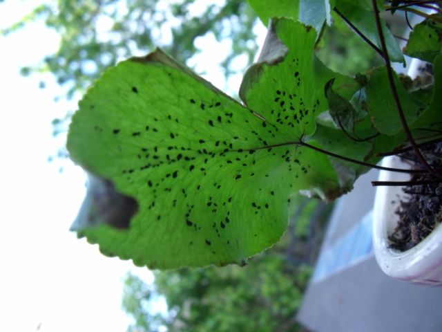 , je viens de regarder ma petite plante d'intérieur, c'est une Hemionitis arifolia et voilà que je vois pleins de petites bêtes noires (de la taille d'une puce à peu près) attachées sous les feuilles et aussi dessus et sur les tiges.
