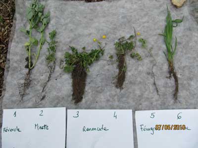Sur la 2° : féverole, minette, renoncule 1, renoncule 2, fénugrec et avoine.