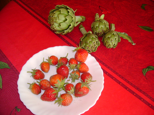 c'est pas gentil de faire envie......plus au nord de la France, les fruits sont en cours de formation sur les fraisiers, et ici comme on est morts de soif( inhabituel pour la Normandie, mais réel) on vas pas en avoir de si belles de si tôt!