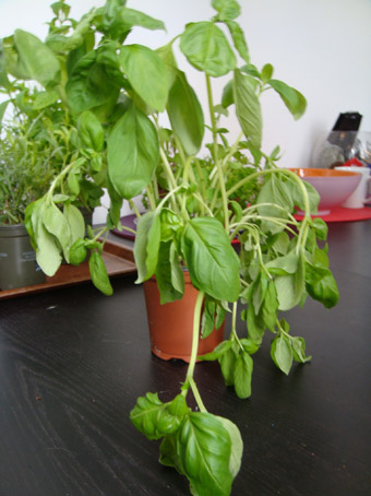 Puis une photo de leurs place dans l'appartement. Et enfin des photos de l'état des plantes ce midi. On voit l'oseille au fond. J'ai dû couper l'oseille et l'aneth qui étaient complètement tombées et toutes flétries... Je ne comprend pas... Les pots sont en plastiques bio recyclé sauf pour l'oseille, c'est un pot special bio fait à base de mélange de terre et je ne sais pas quoi, c'est un pot assez mou.