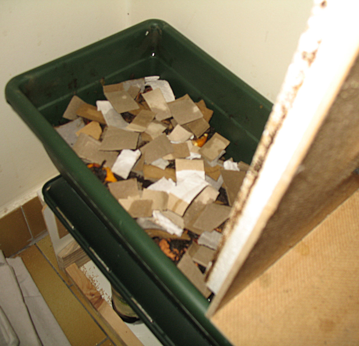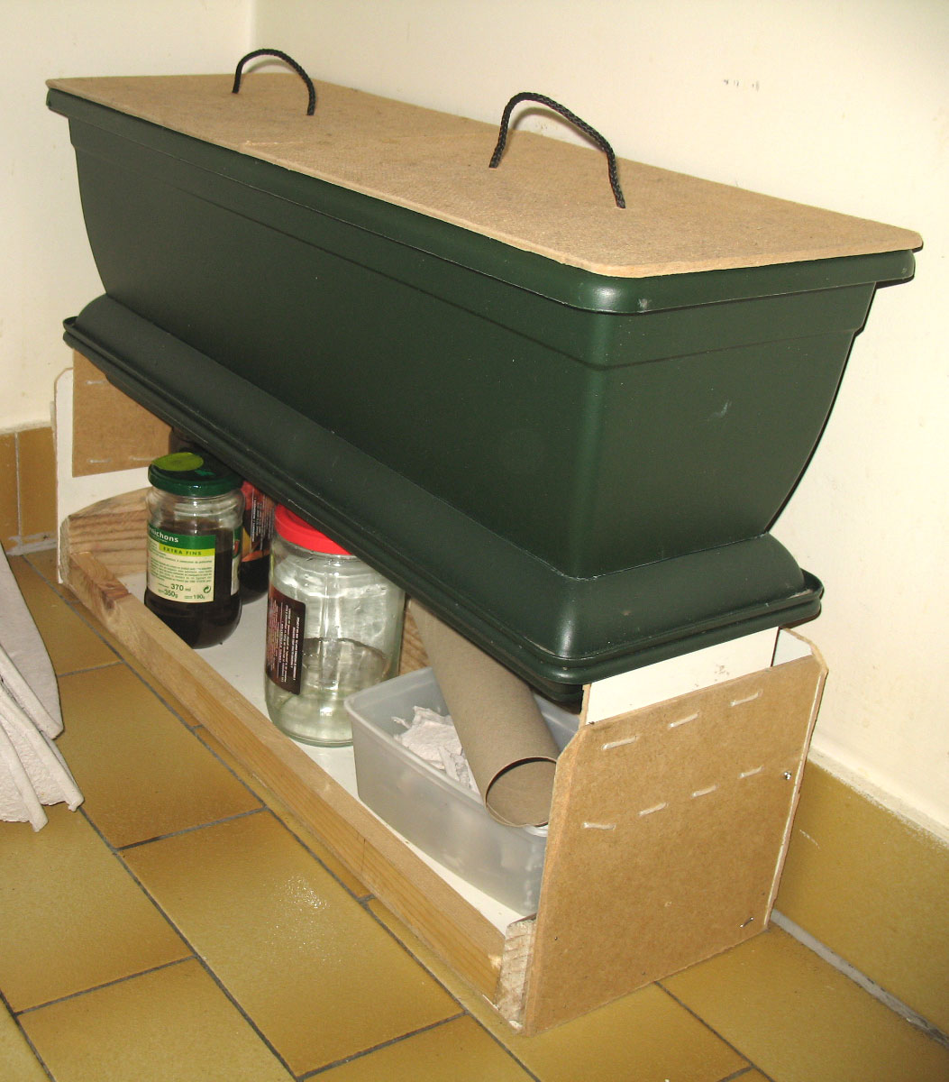 Pour des raisons d'économie de moyens, il s'agit à la base d'un bac à fleur en plastique pas cher. Vert foncé, pour que les vers ne prennent pas la lumière (c'est pas leur truc).