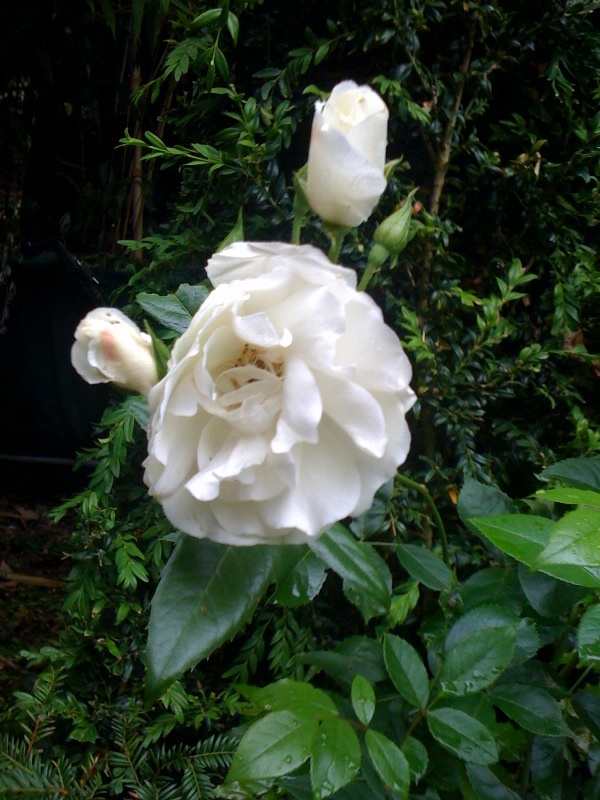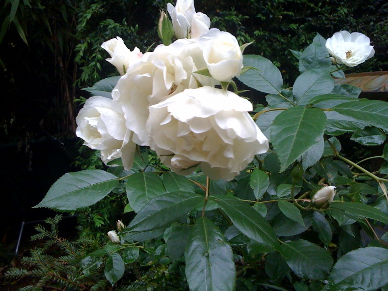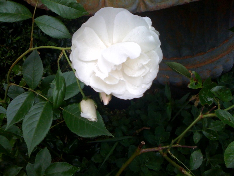 j'ai 2 pieds de ce rosier dans mon jardin, plantés par l'ancien propriétaire. Connaissez-vous son nom ? Il n'est pas très grand, mais peut-être pare que je l'ai mal taillé. Il est blanc pur, avec parfois quelques minuscules tâches roses. Il ne sent presque pas.