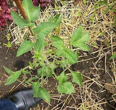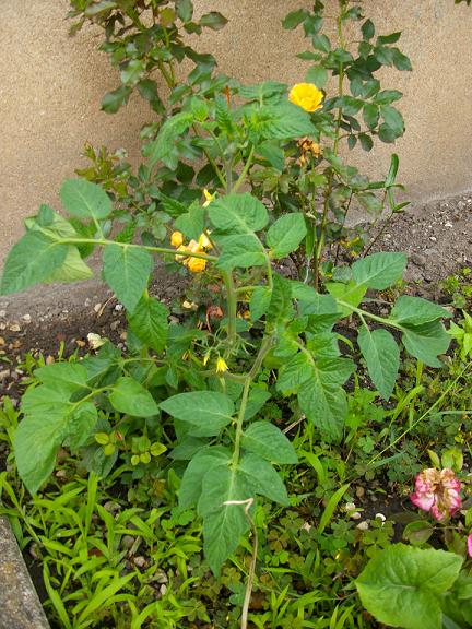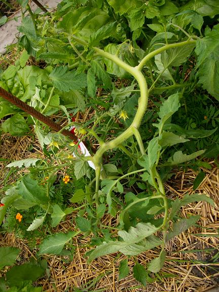 avec le mauvais temps ,je me bornais à récolter fraises, salades, radis etc. laissant bien tranquille mes chères tomates. erreur ,certaines n'étant pas tuteurées, rampaient sur le sol. bon elles redresseront la tête ici vivent en contreplantation, 25 plants ! pour finir une sauvage, enfin 2 dois je préciser ,qui poussent là où se trouvait leur maman en 2009 "belle arlèsienne"! des auto semis !