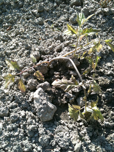 J'ai planté mes tomates un peu tard dans la saison, une semaine après un plant puis semble-t-il un autre ont bien "mauvaise mine" : feuilles tachées de jaune puis de marron à partir du bord, tige qui vire au marron. Excés d'eau ou parasite dans le sol... A savoir que mes salades ont toutes été mangées par la racine, j'ai donc, en plantant rajouté un insecticide du sol (même si j'ai horreur de trop utiliser ce genre d'insecticide), puis rajouté un engrais tomates bio. Les aubergines qui jouxtent ces plants, eux vont plutôt bien.